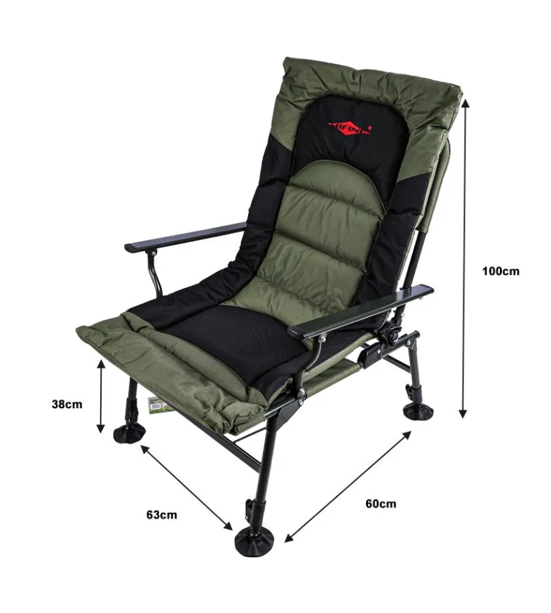 С моделью кресла 55065 от Mifine продолжительное ожидание поклевки будет комфортнее. У нее мягкие спинка и сидушка. Они сшиты из износостойкого, крепкого материала, который не боится влаги. Тканевые элементы немаркие, при необходимости легко очищаются. Можно варьировать наклон спинки. Есть два широких изготовленных из прочного пластика подлокотника. Модель складная, что делает проще ее перевозку. Металлический каркас наделен необходимым прочностным запасом и при этом легкий. Сталь долговечная и устойчивая к коррозии. Для простоты установки на изрытом грунте, эксперты Mifine продумали регулировку высоты ножек.
